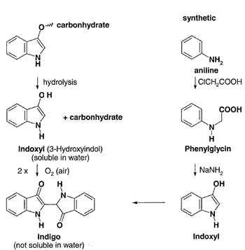 植物細胞利用二氧化碳,光線,水份,氮製成許多化學結構。其中之一,如藍靛。1880 德人 Adolf von Baeyer 在實驗室中從碳,石油中提煉出化學合成藍靛染料,使用方便。1897 起 BASF 公司大量生產,並銷至世界各地(至今仍是最重要的廠),如抗戰時期普及穿著的陰丹士林布衣 (Indanthrene blau) 從此植性的藍靛,一蹶不起......