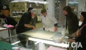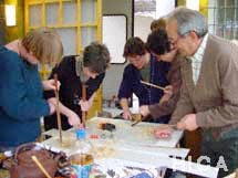There had been an advanced course »Lining with paste« at the HICA workshop in Mannheim from May 6th to 8th, 2004. 14 restorers participated. And most of them came from Germany, but also from Spain (2), France (1) and Switzerland (4). The participants in general either work as the head of a restoration workshop, e.g. of the Bavarian State Library in Munich, the Institute for Preservation of Archival Materials in Ludwigsburg, the State and University Library of Bremen, the Foundation of Prussian chateaus and gardens Berlin-Brandenburg or as the head of a well known private workshop. There was one free lance artist in the course, Susanne Heilmann, who has been painting on Chinese paper for already 20 years.