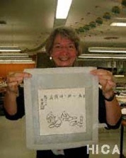 The newly learned techniques were then practically applied on own sheets. The exercise sheets, which had already been lined once, were now provided with a silk bordering and a backing, during which all parts are labeled accordingly. The lateral bordering pieces are called »pillars«, and the borderings at the bottom and on top are named »earth and heaven«. The original sheet that is to be lined is considered as the »heart«, and for the lining paper the term »life« is applied. The appropriately mounted picture was then provided with a doubly lined backing. This consisted of two long-stranded restoration papers lined in opposing directions. Finally the scroll painting was stretched on the karibari. Mrs. Hua was then besieged with countless questions to the subject. The demonstration of the lining on silk was as interesting as the smoothing of the finished objects with the stone or a glass bead necklace.