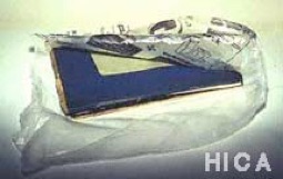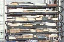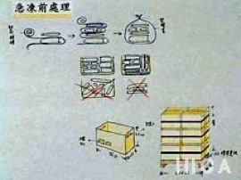 先吸乾多餘水份 → 每件書畫分別用膠布或膠膜分隔包裝,以免黏在一起,每本厚度不超過 10 公分,否則內部不易乾燥 → 再將這疊裝好的書裝入大塑膠袋內,包紮好放入紙箱中,平整入箱,貼上標籤,註明館名、位置。紙箱不宜太大,因為紙浸水後重量大增,箱子兩旁最好有提口以便提放,紙箱一般尺寸為 56 x 35 x 47(高) cm → 裝箱後,放上木製的運板,歐洲標準規格為 120 x 80 cm可放三層(約 12 箱),高度不超過 150 cm,後捆紮固定於托板上 → 以舉重機裝入冷凍貨車 → 送進急凍工廠( -25 ℃ )。