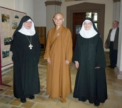 Nun, ich dachte, das ist eine gute Gelegenheit um Sankt Hildegard in Bingen einmal wieder zu besuchen und Huimin Bhiksu einen Einblick in das Leben in einem christlichen Kloster in Europa zu bieten. Gute Idee, sagte Schwester Dorothea, als ich sie mit dem Vorschlag anrief: Der Dalai Lama war vor vielen Jahren auch schon mal bei uns gewesen! So fuhren wir denn Ende August, nachdem auch Mutter Clementia dem Besuch zugestimmt hatte, mit unserem chinesischen Abt nach Sankt Hildegard. Wir erlebten ein fröhliches Wiedersehen und hatten eine großartige Führung durch das Kloster und die Restaurierwerkstatt. Seit unserem letzten Besuch war die Werkstatt um ein dreifaches vergrößert worden. Uns beeindruckte sehr die zeitgemäße und hochwertige Ausstattung, sowie die zunehmende Aktivität der Werkstatt. Dies ist sicherlich auch dem hohen Engagement der Leiterin, Schwerster Dorothea, zu verdanken, die jede Gelegenheit der Weiterbildung und Entwicklung nutzt. Während unseres Aufenthalts stand gerade ein historischer koreanischer Wandschirm mit einer chinesischen Weltkarte zur Restaurierung an. Da Meister Huimin auch ein Meister der elektronischen Medien ist, konnte er uns im Handumdrehen auf seinem iPad, der interessanterweise in den tiefen Gewölben des Klosters funktionierte, Ursprung, Herkunft und Verbreitung dieser Art von Weltkarte recherchieren und das in allen Weltsprachen. Wow, wir waren mächtig beeindruckt!