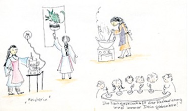 Das Herstellen von Kleister wurde ausführlich demonstriert. Um ein zügiges Arbeiten zu ermöglichen, füllt Frau Hua den längere Zeit gekochten Kleister in Einweckgläser ab. So steht jederzeit die Grundmasse "Kleister" zur Verfügung. Sie wird dann ähnlich wie Glasnudeln durch eine Presse gedrückt. Nach längerem Zerstampfen in einer Steinmulde entsteht eine glasige, geschmeidige Masse, die, zuletzt durch ein Rosshaarsieb gedrückt, gebrauchsfertig ist.