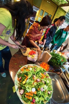 The last concert in my workshop had been long ago. A hundred people had attended it; however, june is vacation time and therefore inconvenient for many people. I resolved to combine the concert with a home cooking class so as to make it more attractive. For this purpose, we hired Mr. Enrico Steuer, an avantgardist cook of the organic movement. The class was vegetarian and comprised the preparation of six courses; using 16 different kinds of herbs. Mr. Steuer quite precisely explained the single steps to our international audience which consisted of 35 people. There was a lot of laughter during the class and afterwards, we enjoyed our menu together.