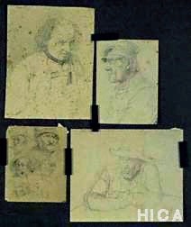 Auf dem Dia sehen Sie einige Zeichnungen. Sie sind auf lignin- und säurehaltige Holzpappe geklebt. Das war damals vom Sammler gut gemeint. Er wollte eine direkte Berührung des Kunstwerkes mit der Hand vermeiden. Was der Sammler damals nicht wußte ist, daß sich nach einigen Jahren das Lignin und die Säure auf die Rückseite des Bildes übertragen und das Bild schädigen würde.
