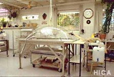 Dies ist ein Vakuumtisch. Er dient zur schonenden Reinigung von Kunstwerken. Man legt ein Bild auf eine feine Siebplatte aus Stahl – wie sie zur Herstellung von Papier verwendet wird. Dann erzeugt man mit einer Wasserringpumpe ein Vakuum und befeuchtet das Kunstwerk. Das schmutzhaltige Wasser wird durch das angelegte Vakuum sofort nach unten abgesaugt. Schmutz und Vergilbungen werden ausgewaschen, ohne daß die Malfarbe verläuft. Es kann auch eine Plexiglashaube über den ganzen Tisch gestülpt werden, innerhalb derer ein feindisperser Wassernebel erzeugt wird. Das ganze besonders empfindliche Bild kann so schonend eingeweicht und gereinigt werden.